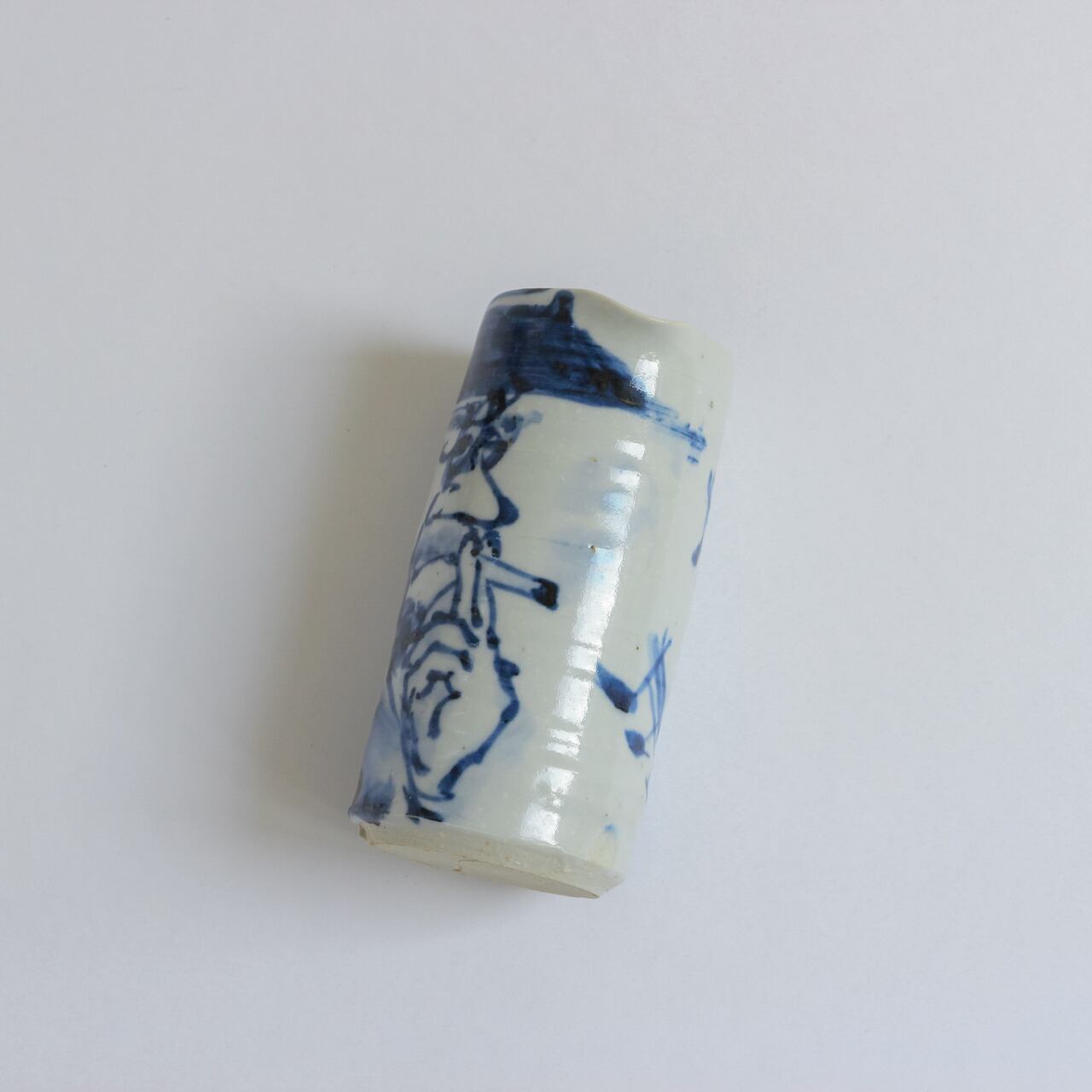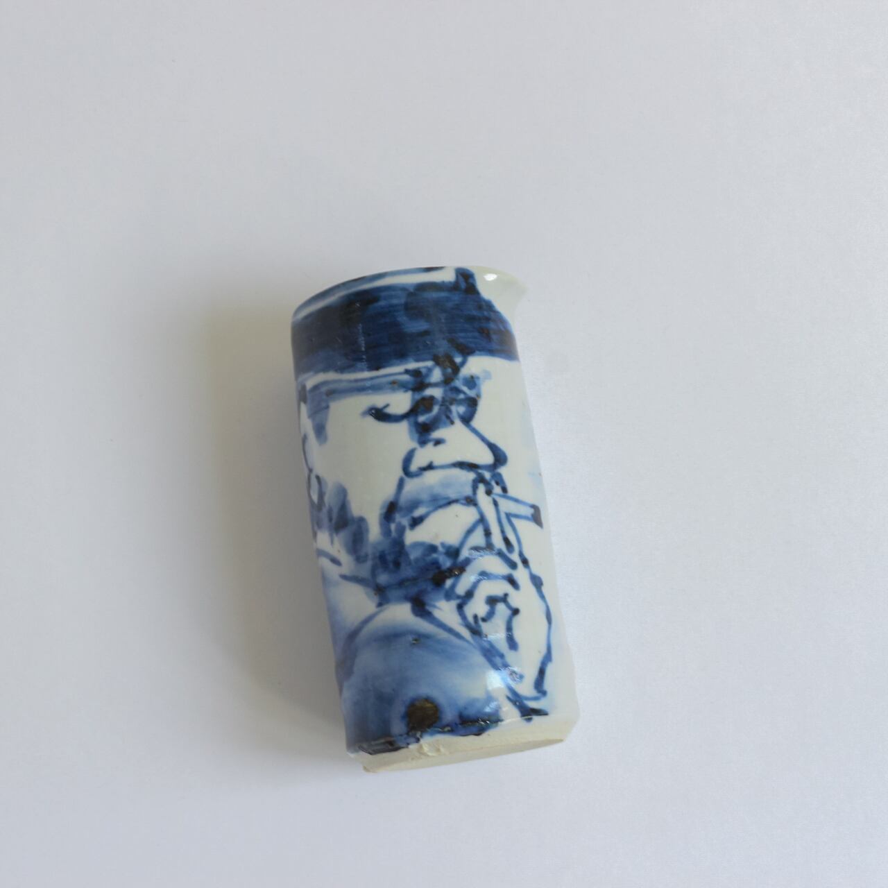 染付で描かれた、タバコを吸う男性と音符がなんとも素敵な花瓶。