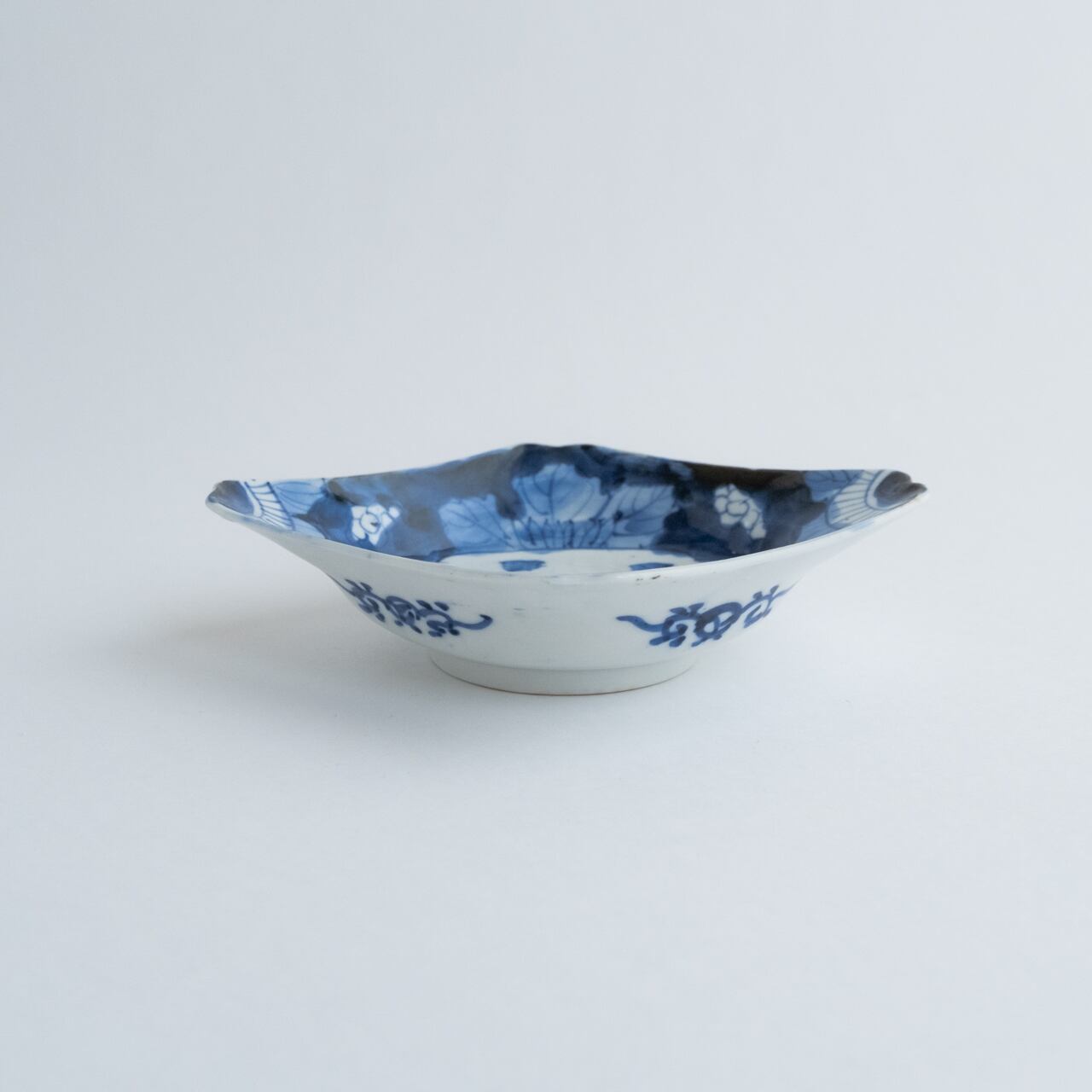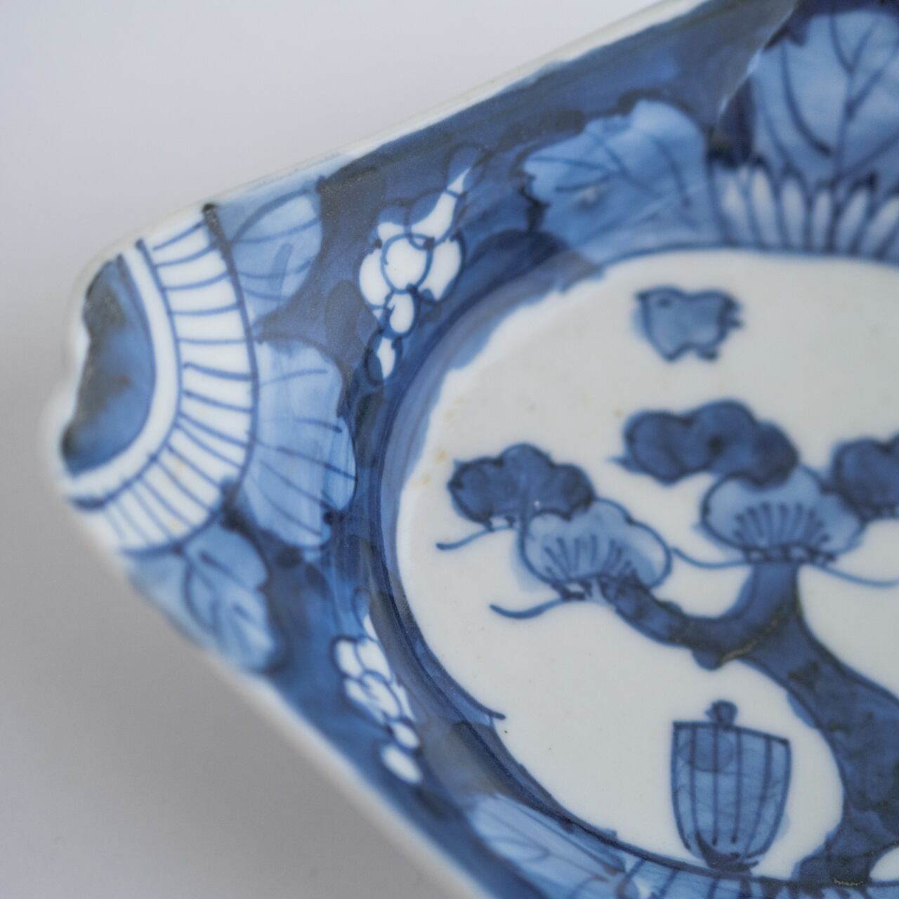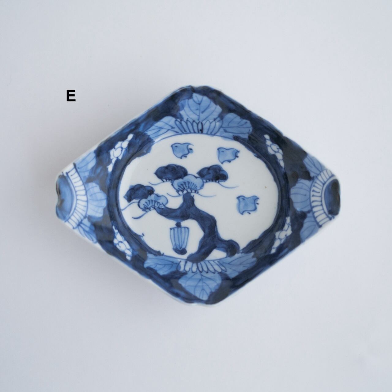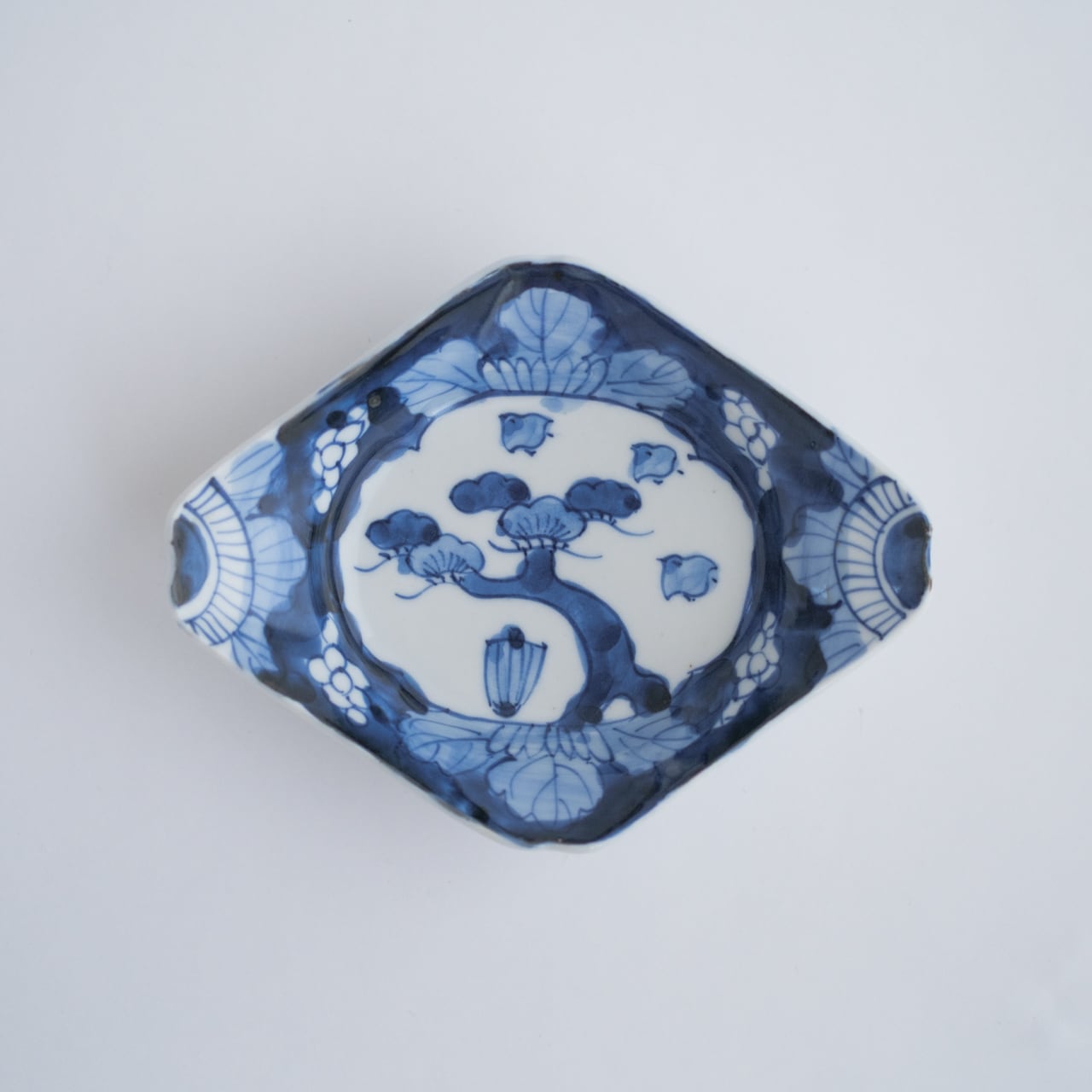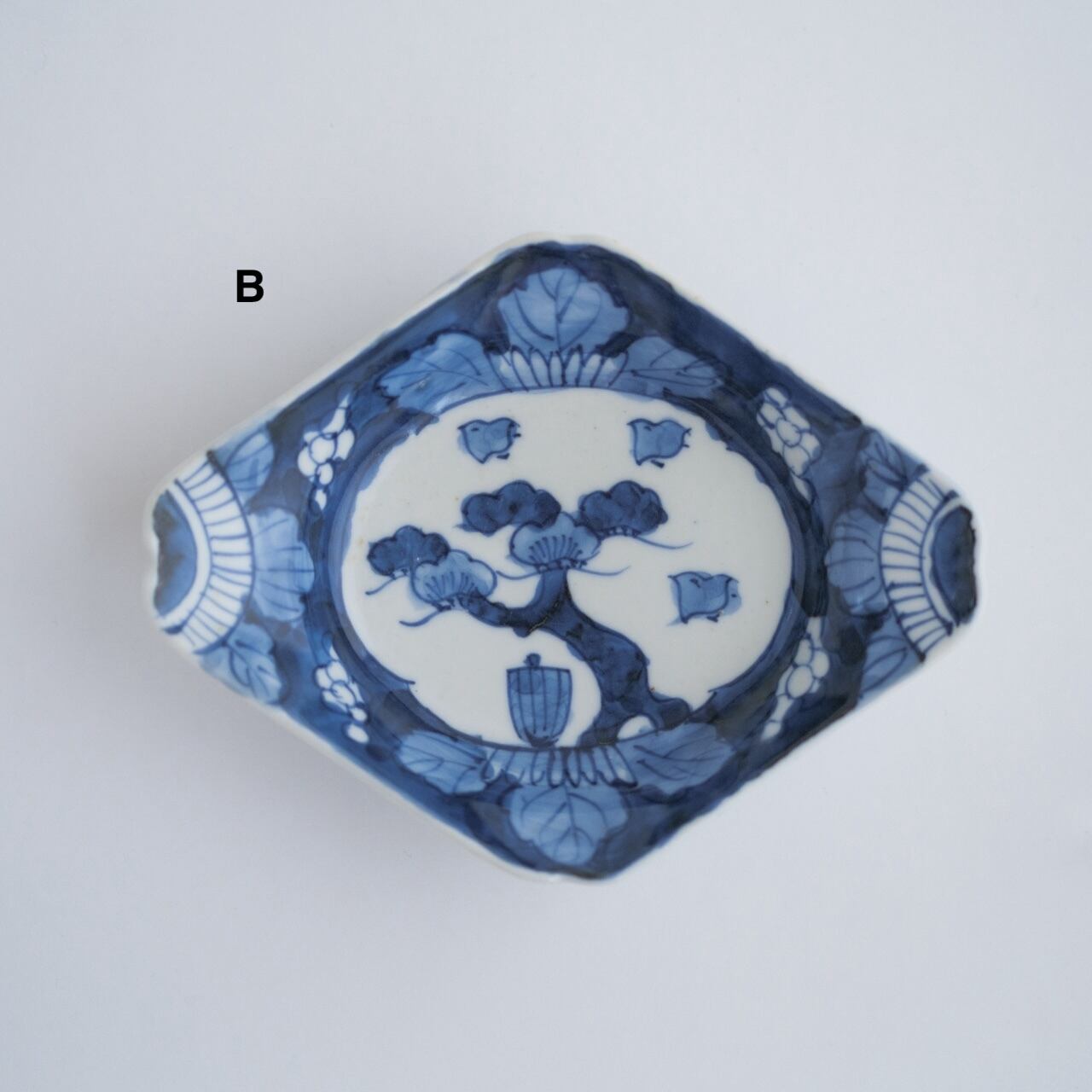 骨董 染付 菱形皿 松と千鳥の図・16cm