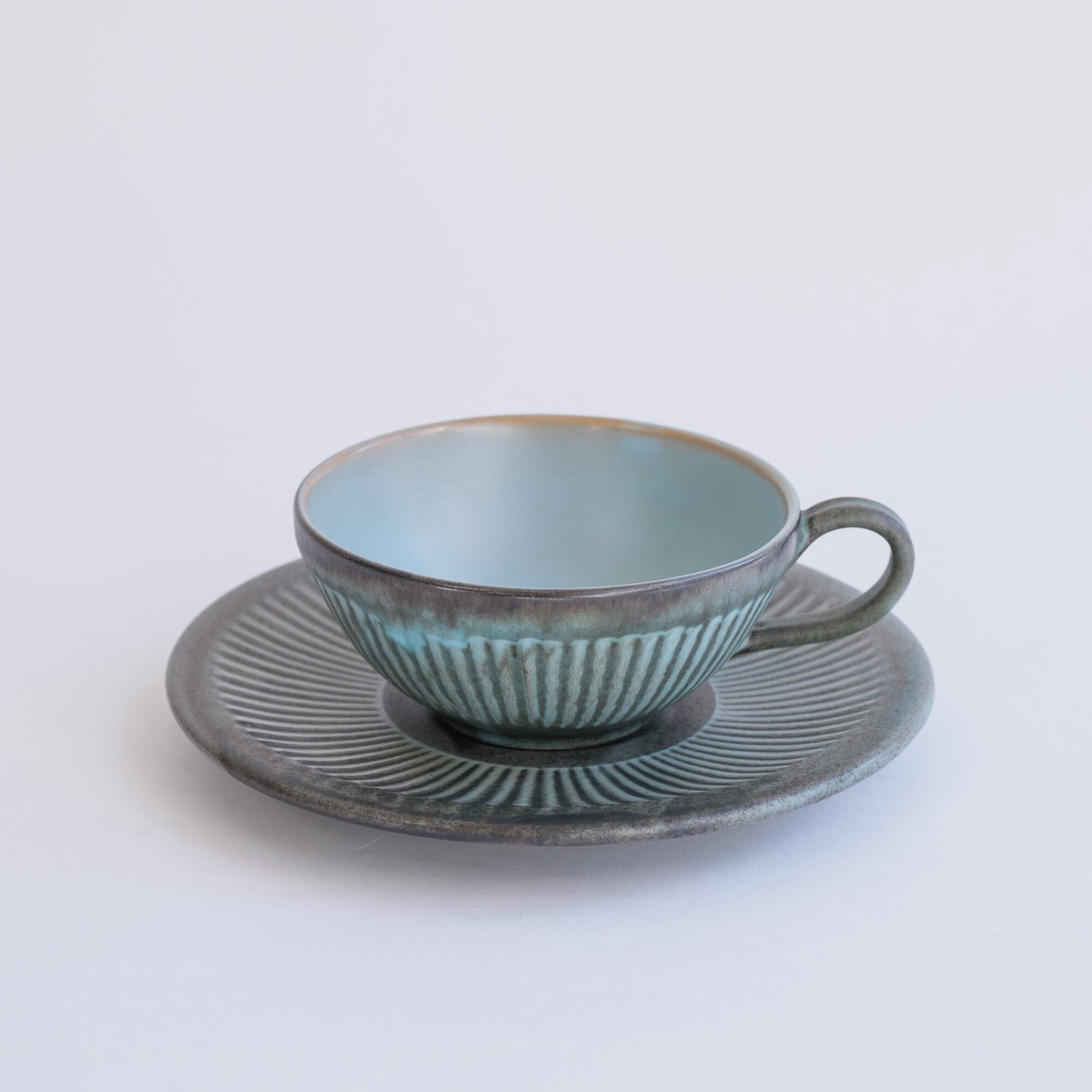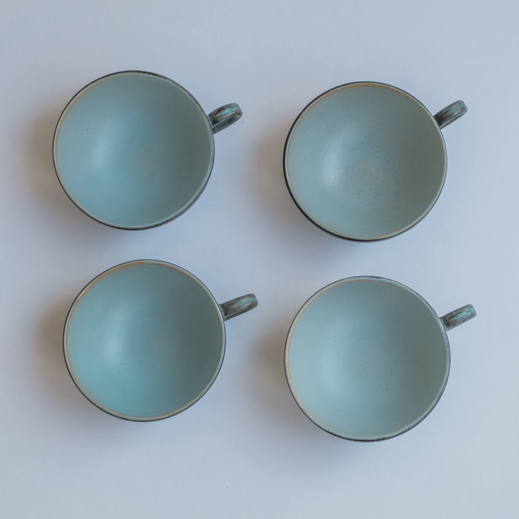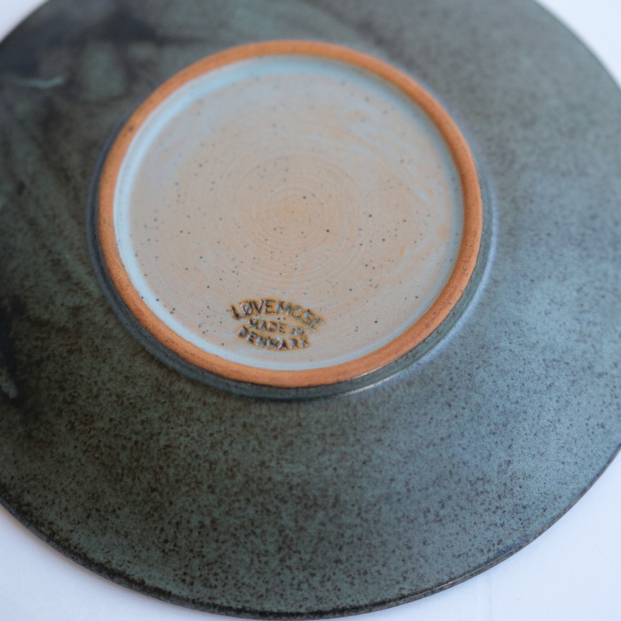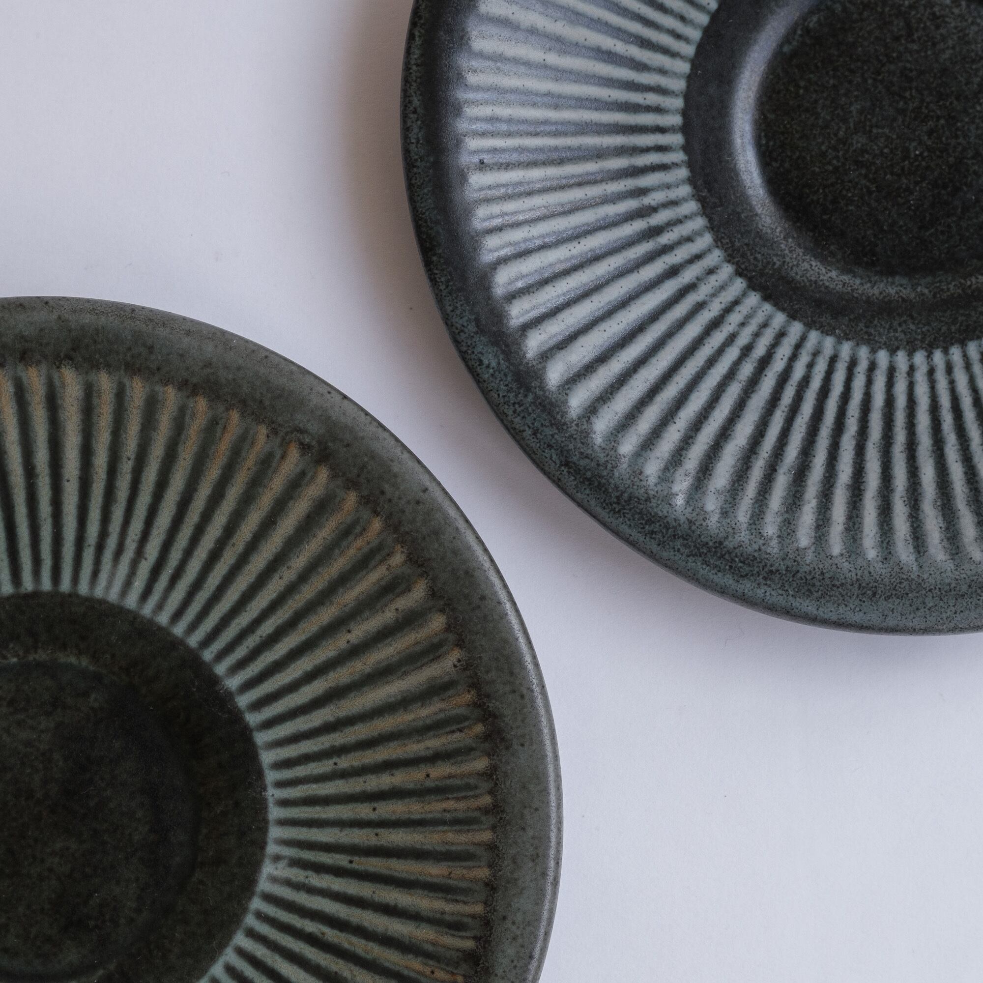 チャコールグレーとターコイズの色合いに赤土の透けている部分があり、内側のターコイズの部分もとても魅力的。寒色系ですが温かみを感じ、いつものテーブルにもすっと馴染むと思います。