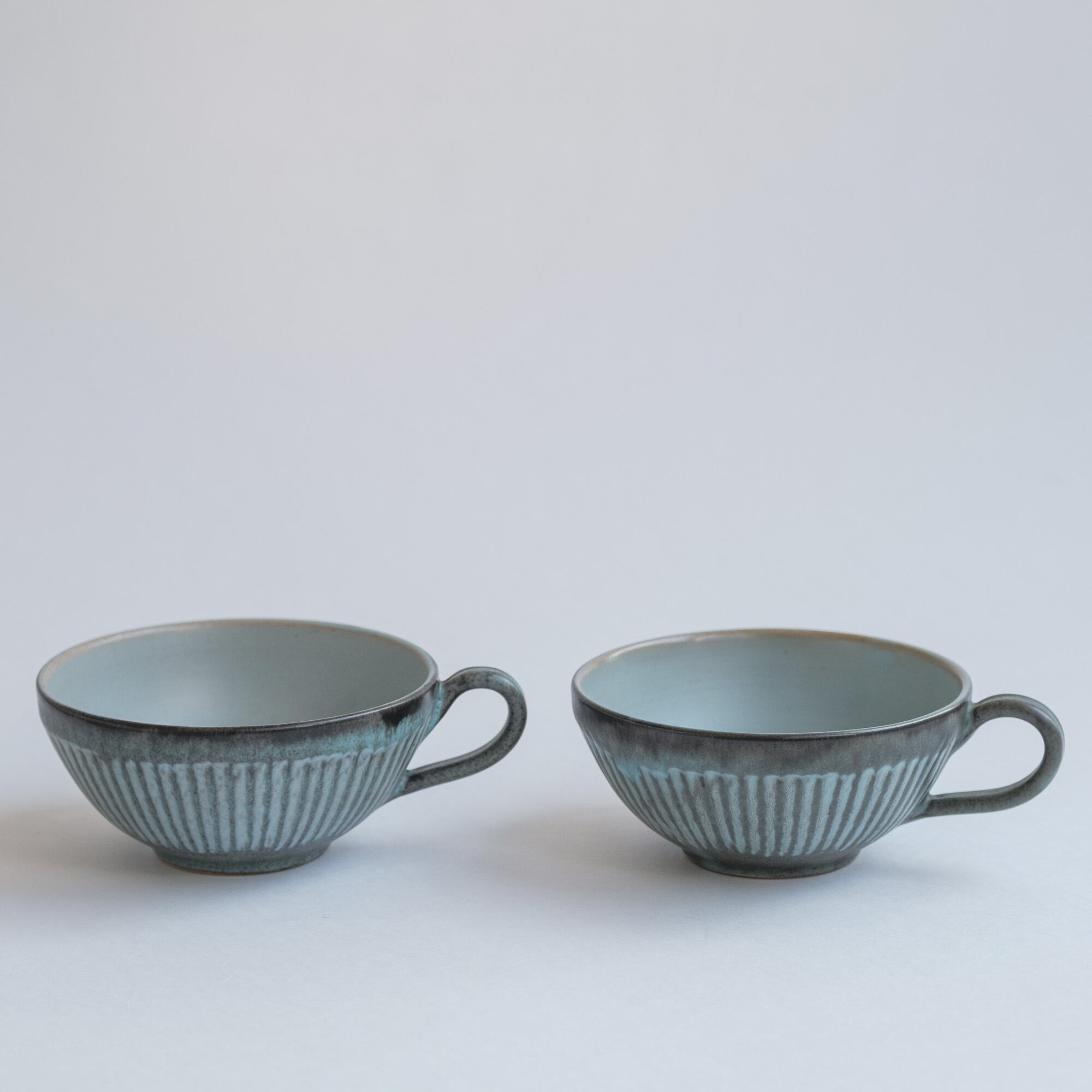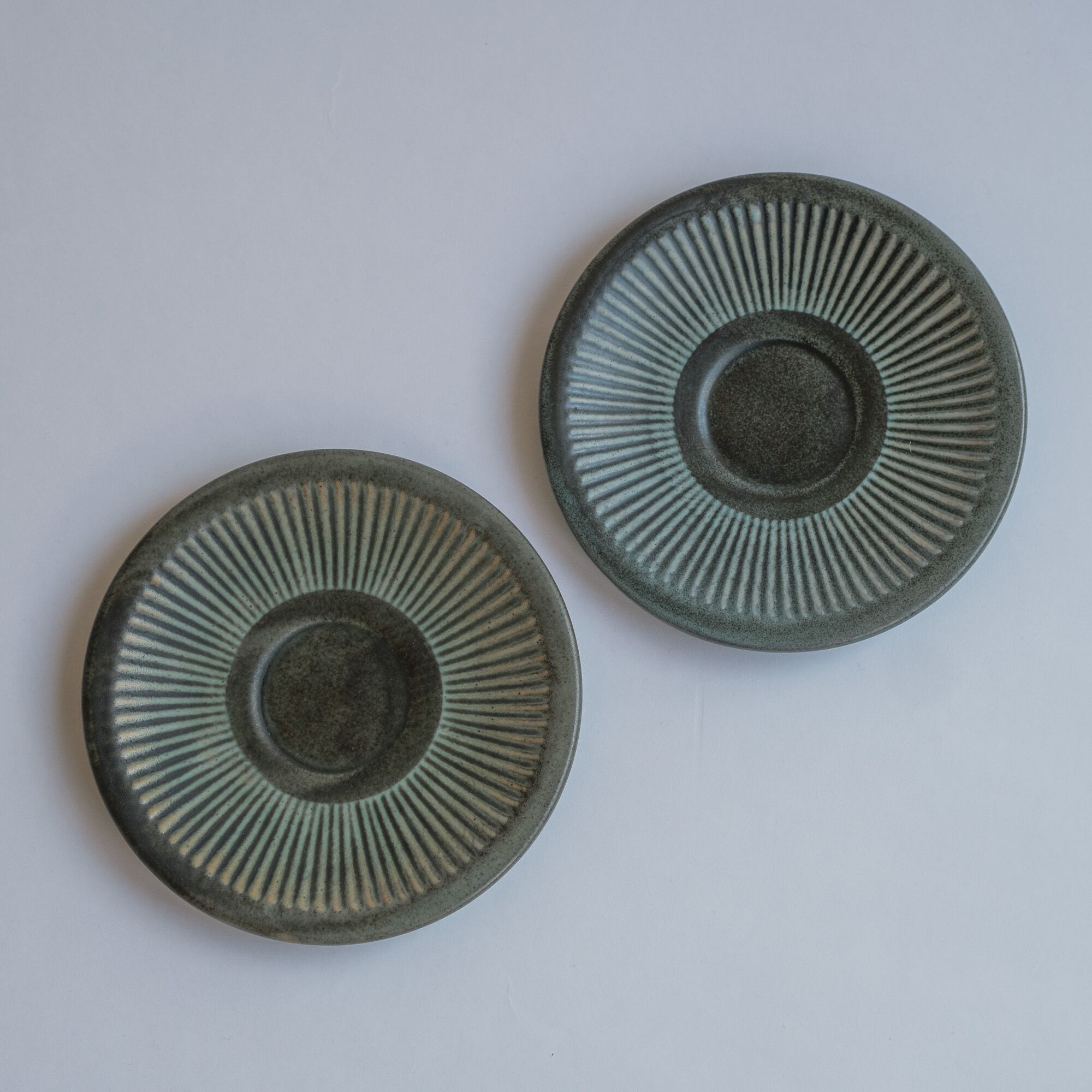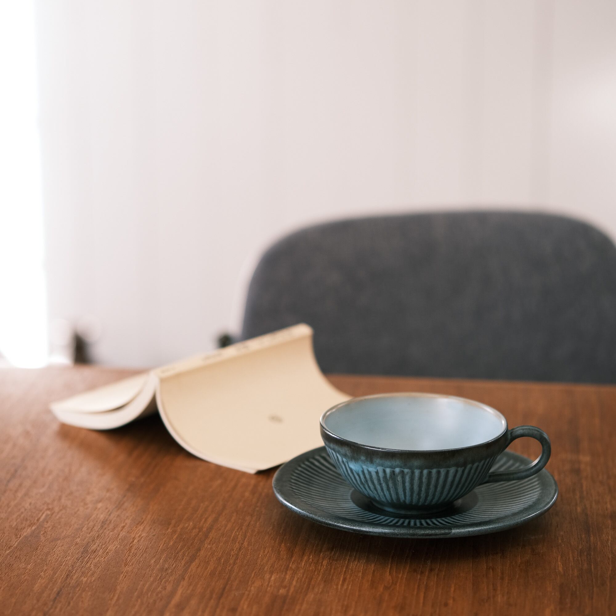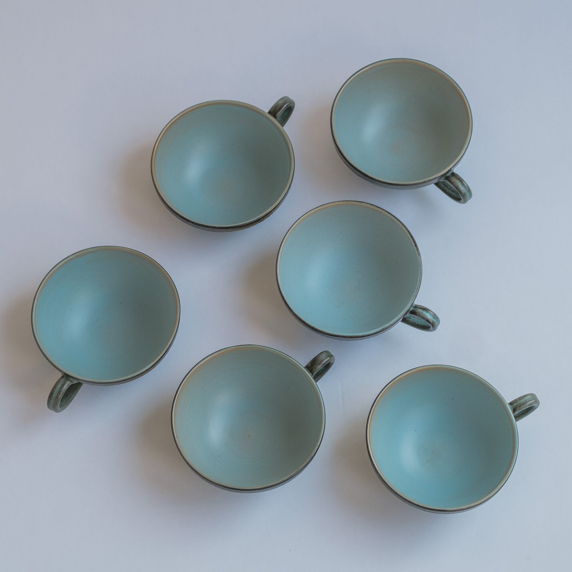チャコールグレーとターコイズの色合いに赤土の透けている部分があり、内側のターコイズの部分もとても魅力的。寒色系ですが温かみを感じ、いつものテーブルにもすっと馴染むと思います。