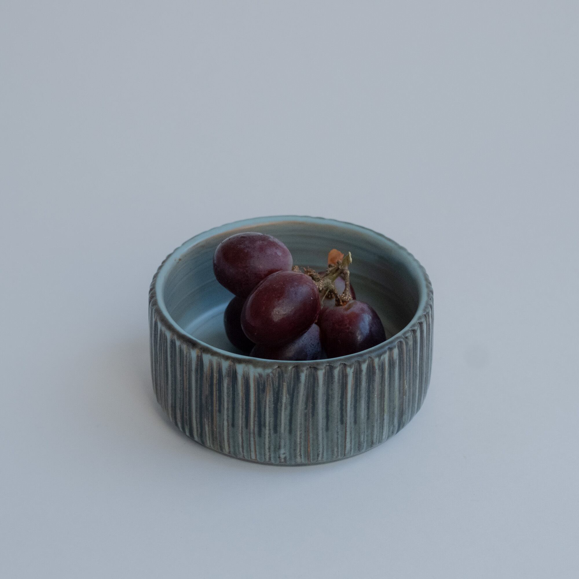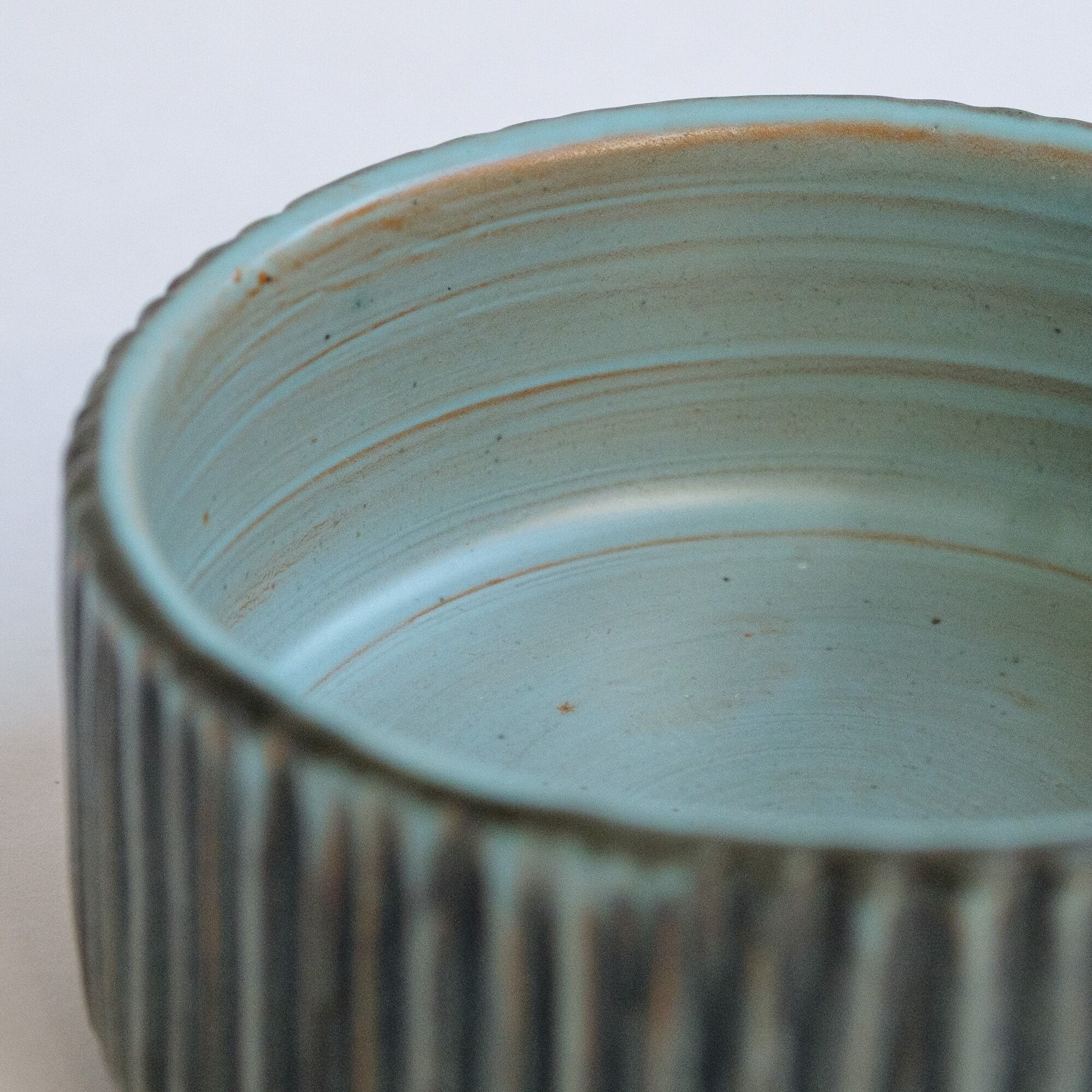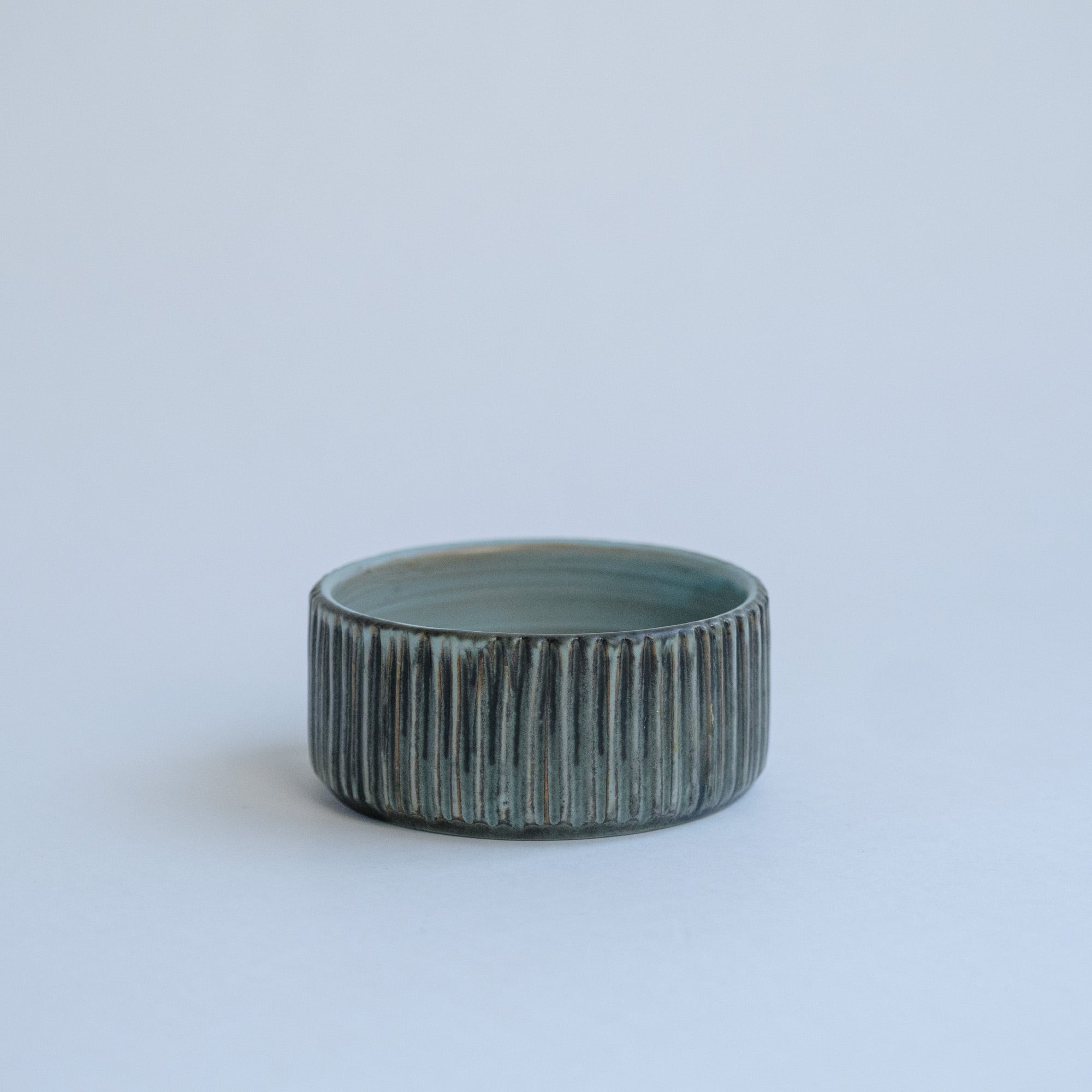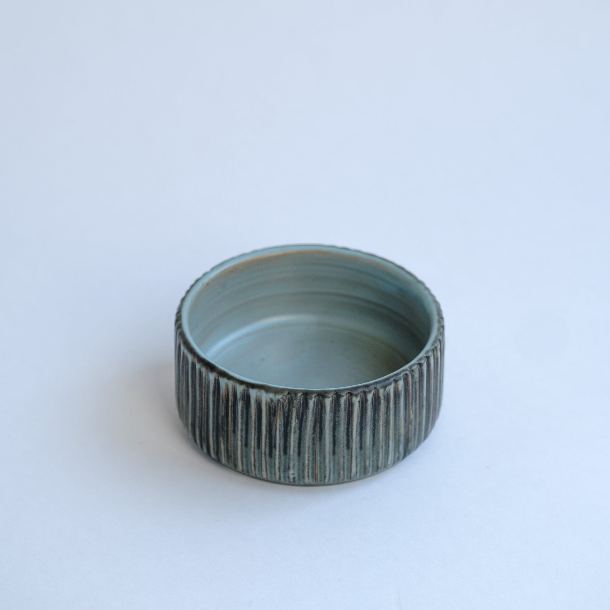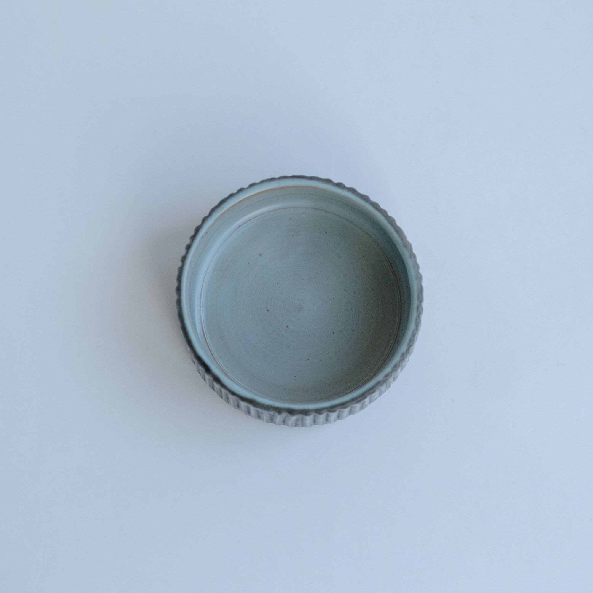チャコールグレーとターコイズの色合いに赤土の透けている部分があり、寒色系ですが温かみを感じます。いつものテーブルにもすっと馴染むと思います。