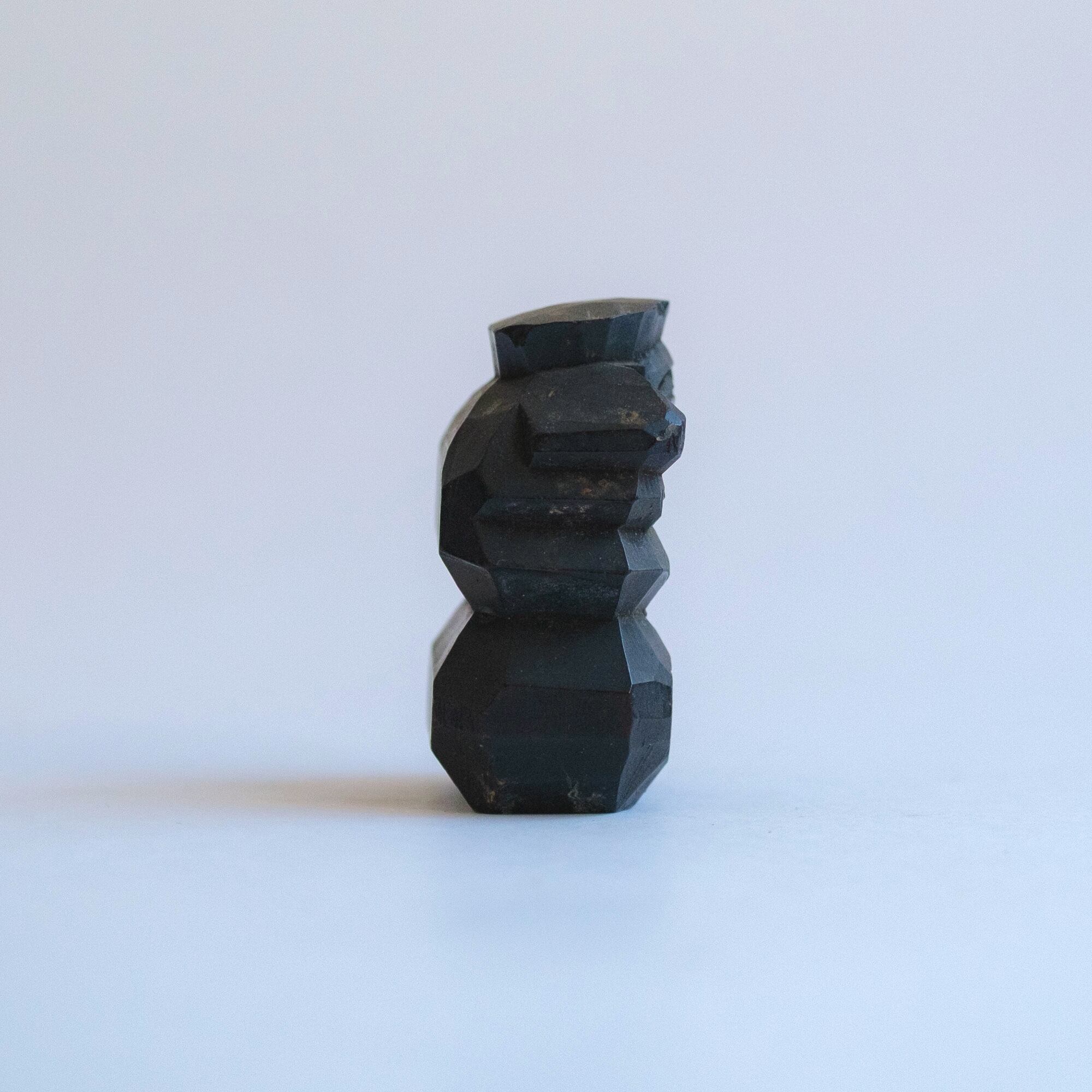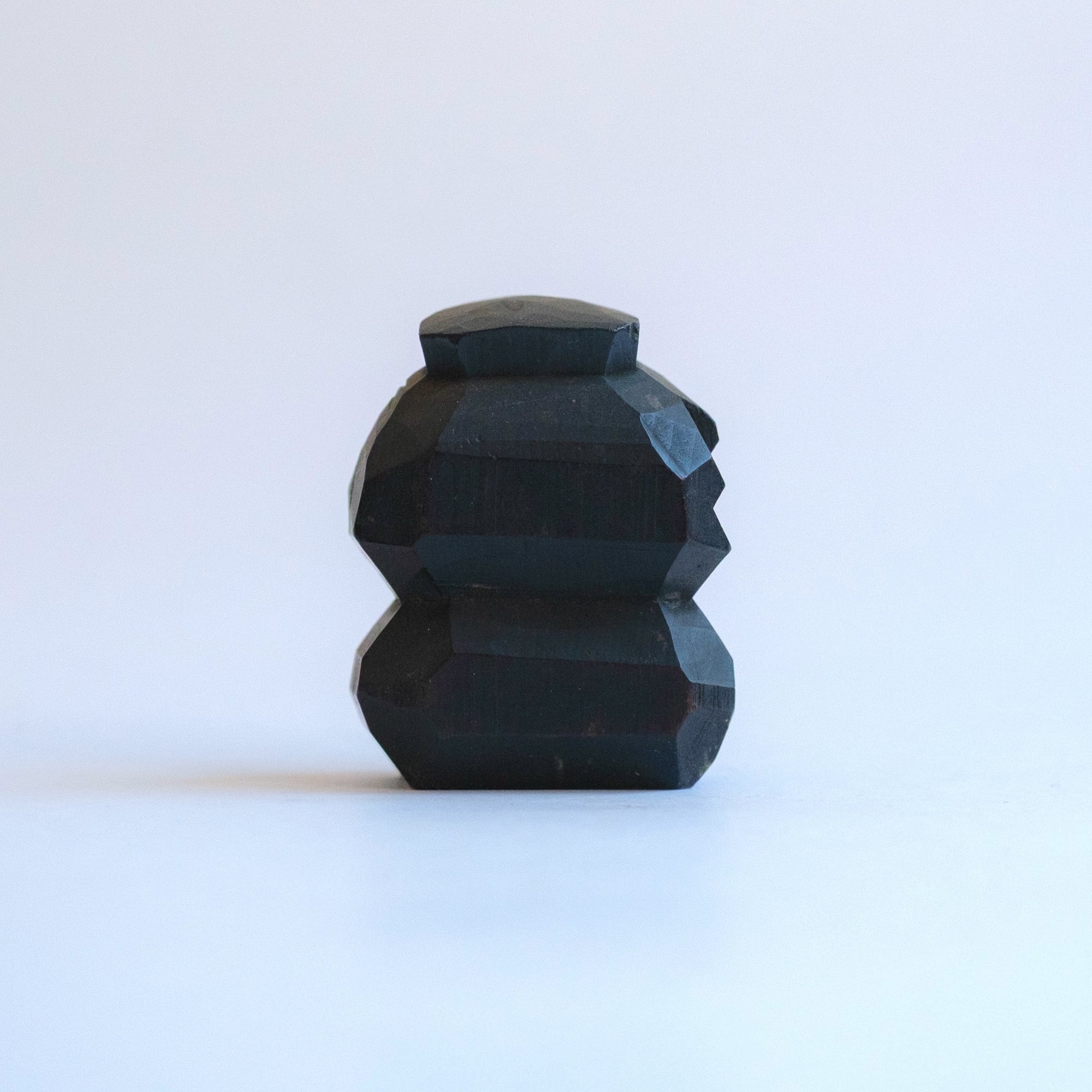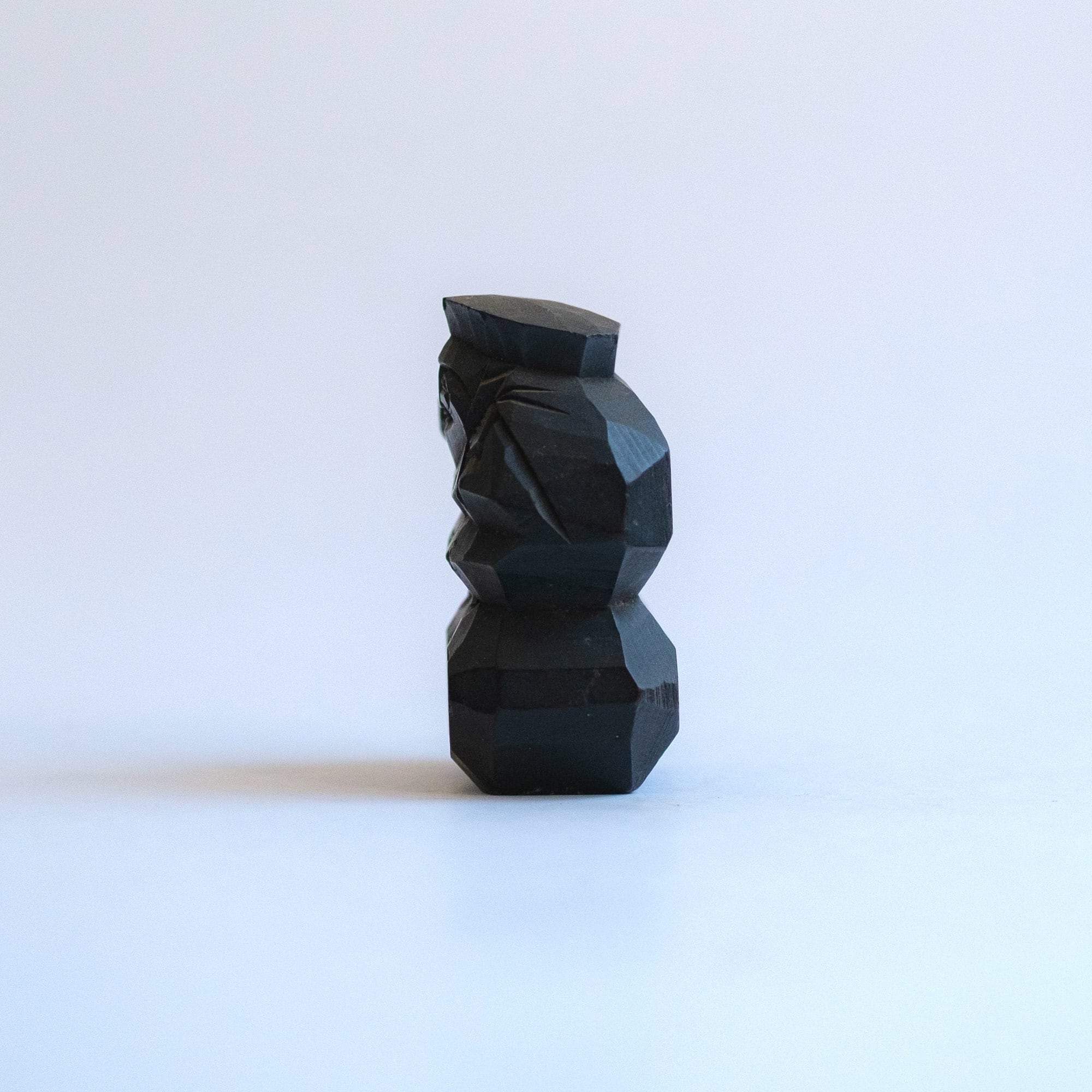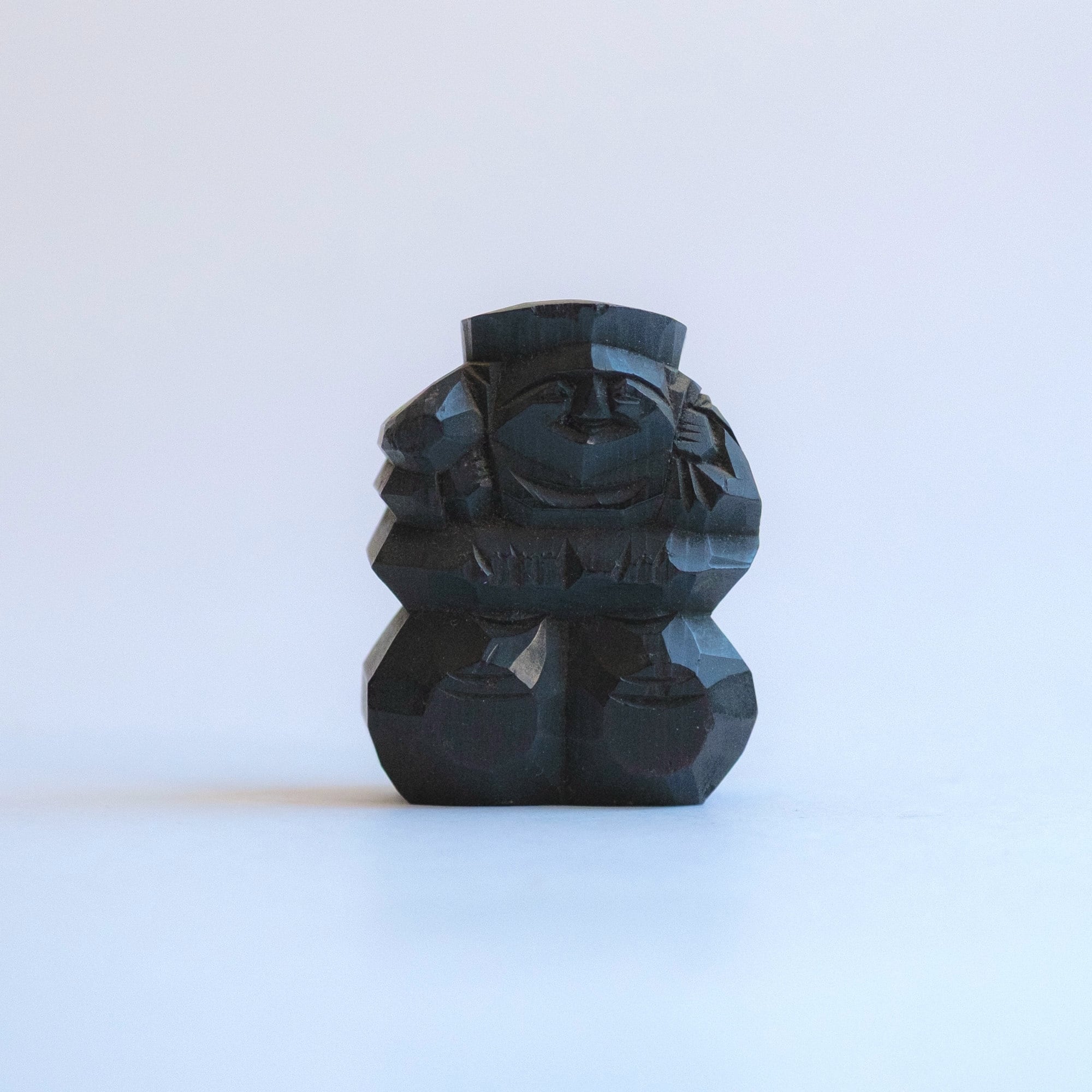 A black-stained wooden figure of Daikoku with a smooth finish. The expression and carving faintly recall traditional Hokkaido wooden bears, suggesting it may once have been a souvenir piece.