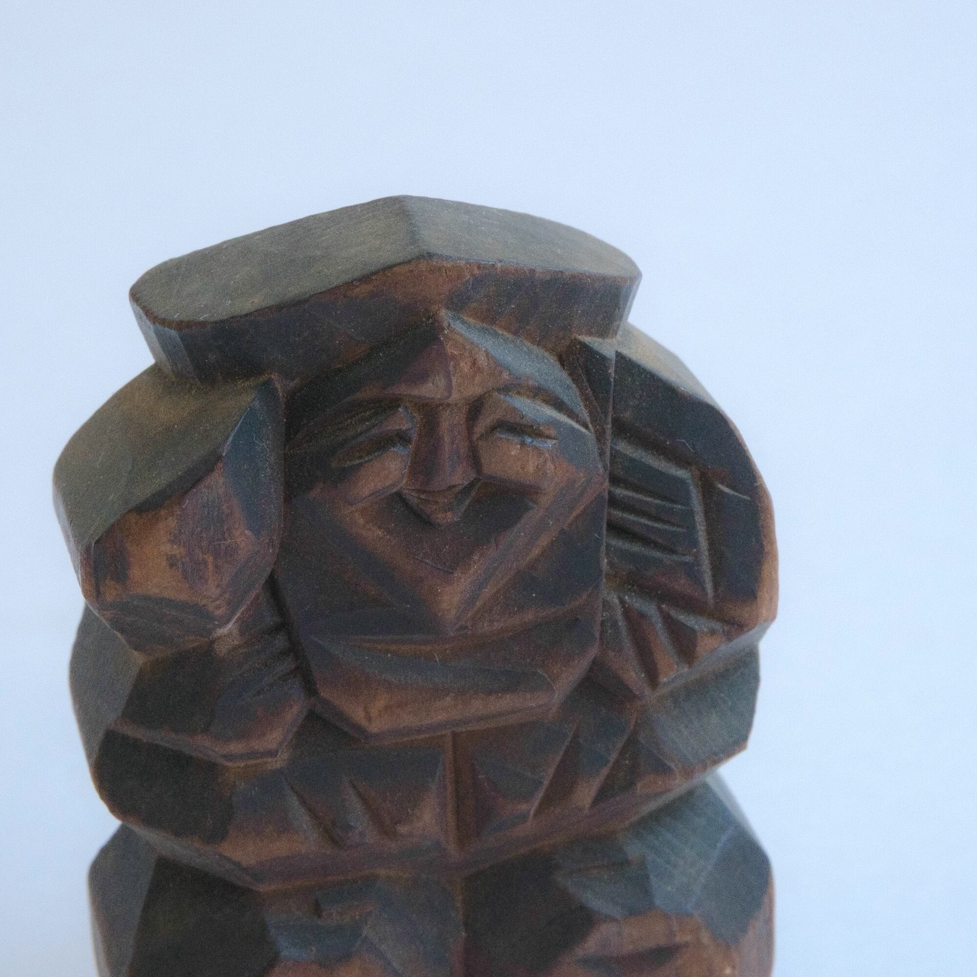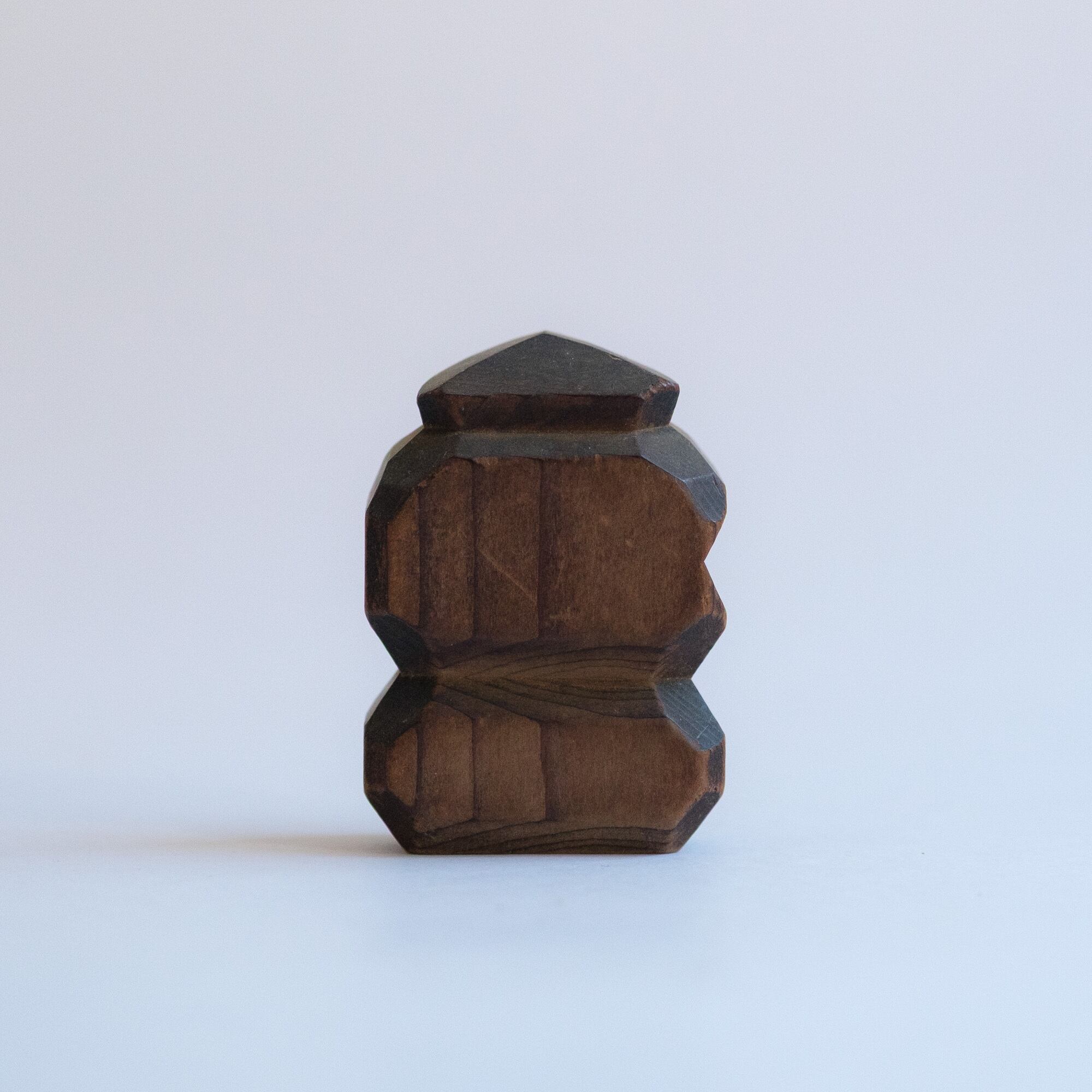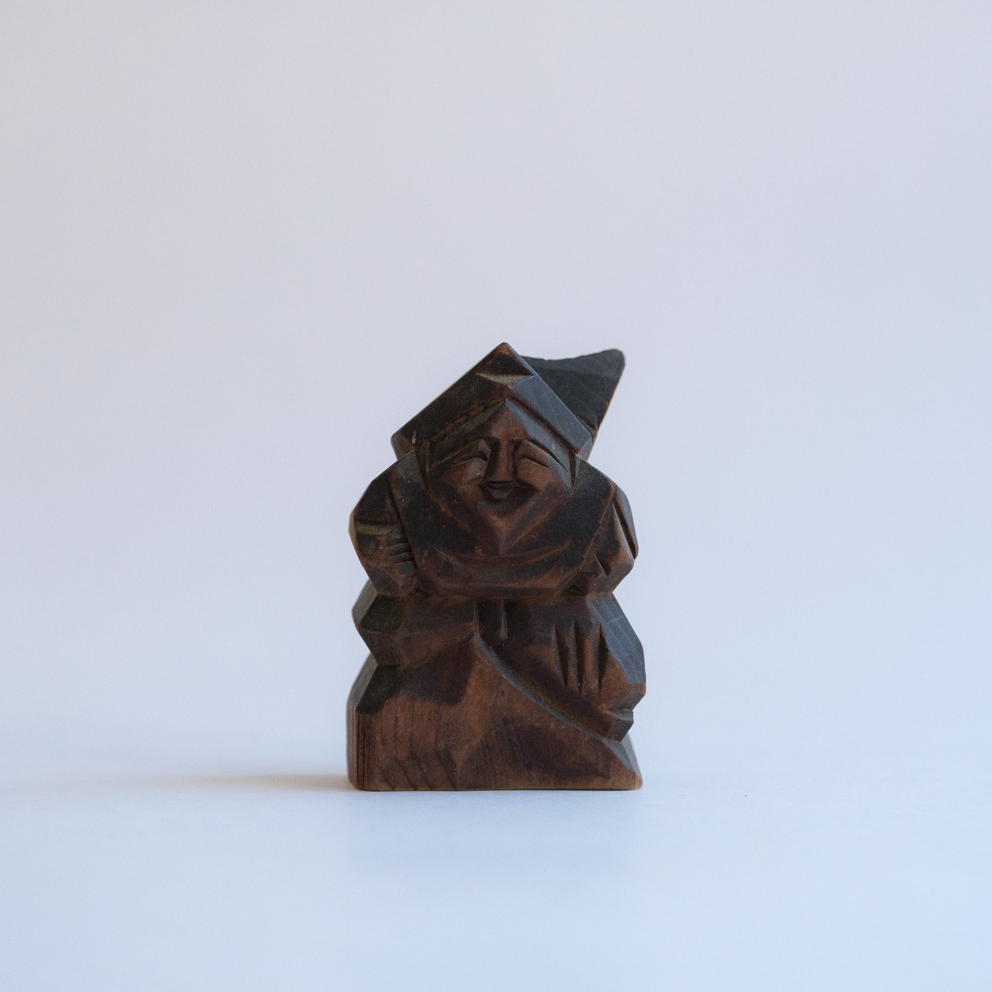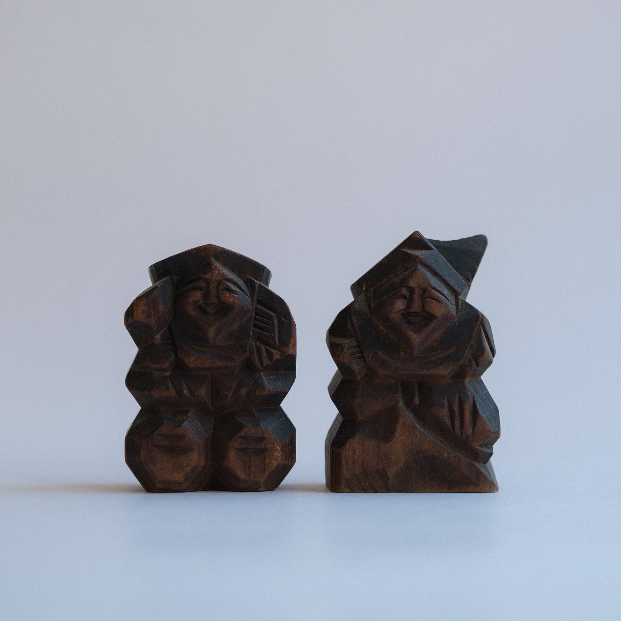 A small carved wooden set of Ebisu and Daikoku with warm, grandfatherly smiles. Likely once a shrine souvenir or devotional keepsake.